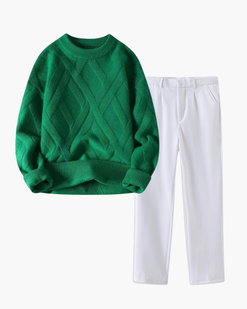Our casual sweater, crafted from a high-quality blend of cotton, offers natural warmth with a smooth, breathable touch. Its slim fit creates a modern silhouette, while maintaining ease and comfort. Paired with our New York straight-fit trousers in premium quality cotton, the ensemble delivers a clean, structured look suited for both casual and more polished settings.
